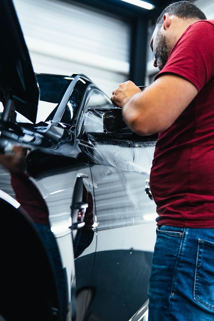 De auto is zorgvuldig gereinigd en voorbereid, zodat het oppervlak volledig vrij was van vervuiling en klaar voor een nauwkeurige toepassing van de beschermfolie.